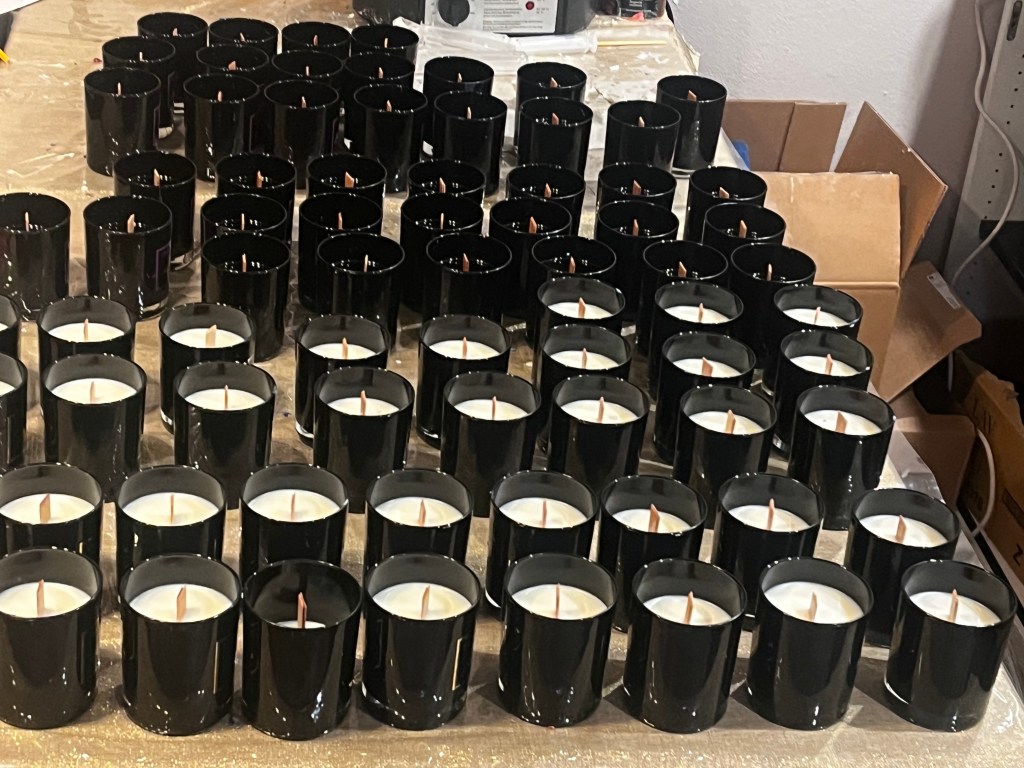 Chaque parfum, soigneusement créé, est attribué à un symbole naturel suisse, indiqué sur un verre teinté noir. Une mèche en bois est délicatement centrée à la main avant de couler une cire de soja et son parfum. Des pierres semi-précieuses et des fleurs séchées sont intégrées au cœur des bougies.